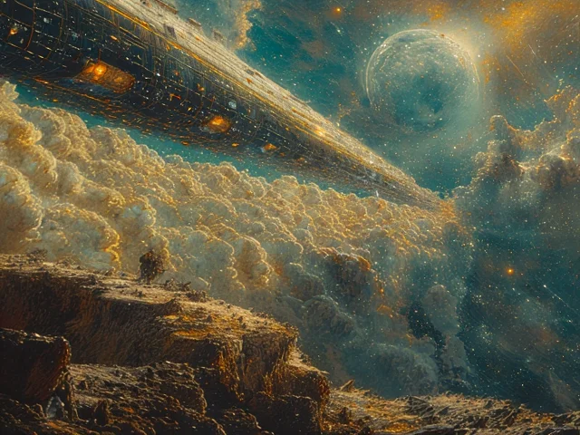 Слънцето потъна на запад, обвито в чуден червеникав воал. На юг пламтяха заледените алпийски върхове. Земята се покри със синкави и виолетови сенки. Горе във висините светеше нежно пурпурно сияние, а из него плуваха зеленикави облачета, каквито в миналите времена човечеството не е виждало или много рядко е виждало, – само когато големи вулкани са изхвърляли огромни количества пепелни маси във въздушната обвивка на планетата. Проникналият сега в атмосферата космичен прах е причина на това предвечерно зацветяване на небето. Наклонявания