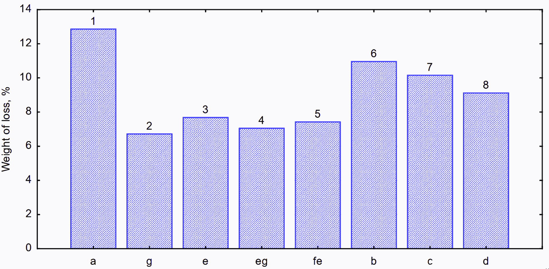 Figure 1. Effect of gums added at different concentrations on the weight loss of rice cake during baking: control (1); sample with gum blend 50:50% (2); sample with xhantan 0.45% (3); sample with xhantan 0.9% (4); sample with xhantan 1.5% (5); sample with guar 0.45% (6); sample with guar 0.9% (7); sample with guar 1.5% (8). (means with different letters are significantly different)