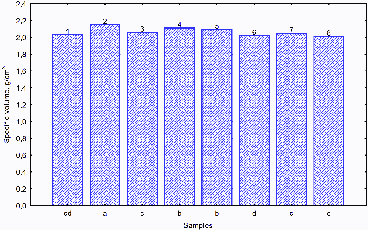 Figure 2. Effect of gums added at different concentrations on the specific volume of rice cake: control (1); sample with gum blend 50:50% (2); sample with xhantan 0.45% (3); sample with xhantan 0.9% (4); sample with xhantan 1.5% (5); sample with guar 0.45% (6); sample with guar 0.9% (7); sample with guar 1.5% (8). (means with different letters are significantly different)