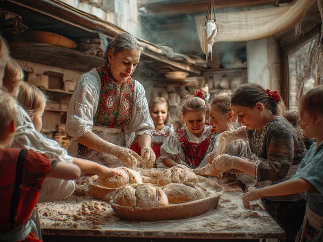 Времето беше мрачно и студено. Влизайки вътре обаче, ни омагьоса топлината на огъня от пещта. Всички заехме място около масата и нощвите (дървеното корито), в което заедно замесихме хляб. Стопанката ни показа житни класове и обясни, че зрънцата в един клас са различни – по-големи, по-малки, по-черни, по-бели, но всички те се смилат и стават еднакви, превръщат се в брашно. След това всички един по един пресяхме брашното. Следващата съставка в нашия хляб беше маята. Жената отбеляза, че в нашите отношения ролята на маята се играе от любовта. Задължително условие, за да се получи хубав хляб, е да се вложат позитивни мисли. Сподели също, че е важно да има търпение и помоли децата да попеят песни, докато набъбне маята. Те изпяха едни от най-българските народни песни, като започнаха с любимата „Седнало е Джоре дос“ и завършиха с пролетната „Братче и сестриче “. Замесеното тесто беше разделено абсолютно поравно за всички. Всяко дете сътвори собствено хлебче.